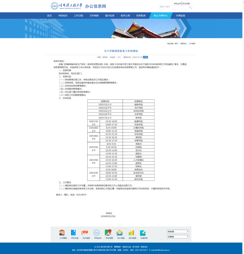 依据《武器装备科研生产单位一级保密资格标准》内容,按照《中共pg游戏电子模拟器委员会关于做好2018年度保密工作的通知》要求,为推进保密管理常态化,巩固保密工作长效机制,学校定于10月15至22日检查各单位保密管理工作。请各组保密员老师负责及时通知本组人员(包括涉密课题组的非密部分),认真梳理本组的保密工作档案,并确保检查时所有人员在岗。http://camel.hrbeu.edu.cn/2018/0929/c1235a202152/page.htm