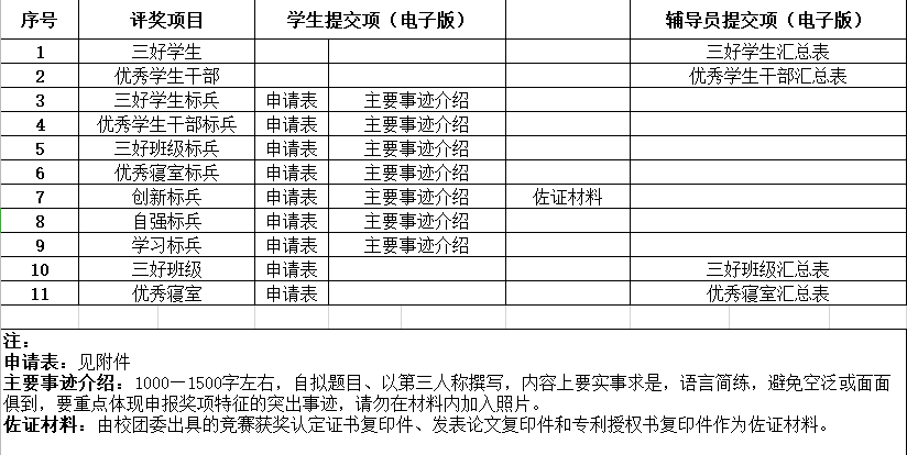 4.三好班级:由班长填写电子版申请表,而后上传给辅导员,各年级辅导员自行进行评选。