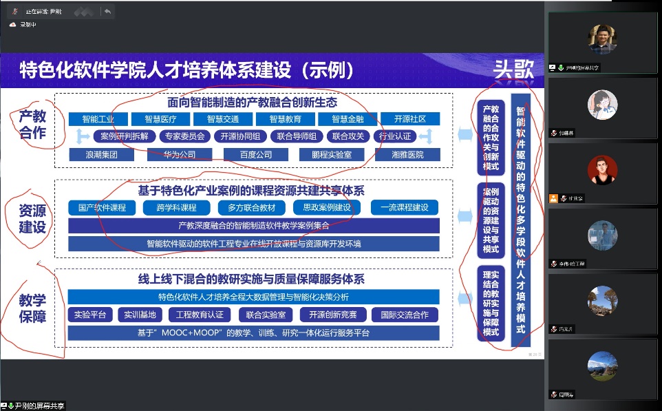 会上冯光升副院长介绍了目前特软学院建设推进的进展情况。学院老师针对我院目前采用的一些教学实验平台以及目前课程建设进展进行简单介绍。尹刚主任针对高校特色化课程与专业建设教学体系创新与应用展开讲解,重点讲解课程建设、专业建设、产教融合的问题关键,介绍了头歌在线课程建设与特色专业创新环境,针对特软学院人才培养体系建设进行深入剖析,针对目前学院所采用教学实验平台遇到的一些问题,演示头歌教学实验平台以提供解决方案。