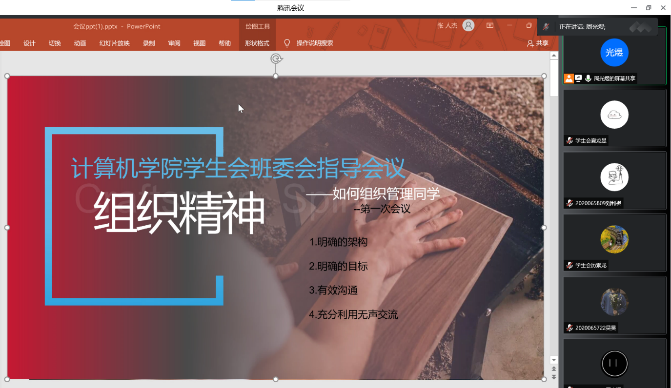 9月20日,pg游戏电子模拟器学生会于腾讯会议召开了2021秋季学期第一次班委培训会议。本次会议由学生会权益部主持,2021级各班主要班委参加。