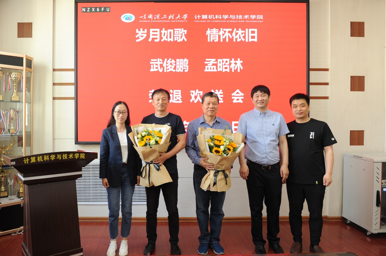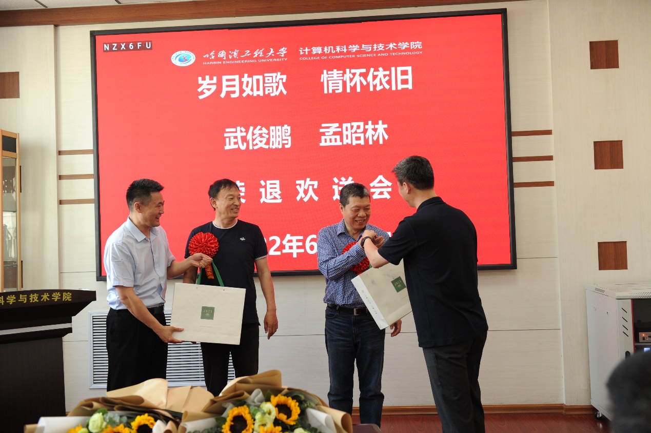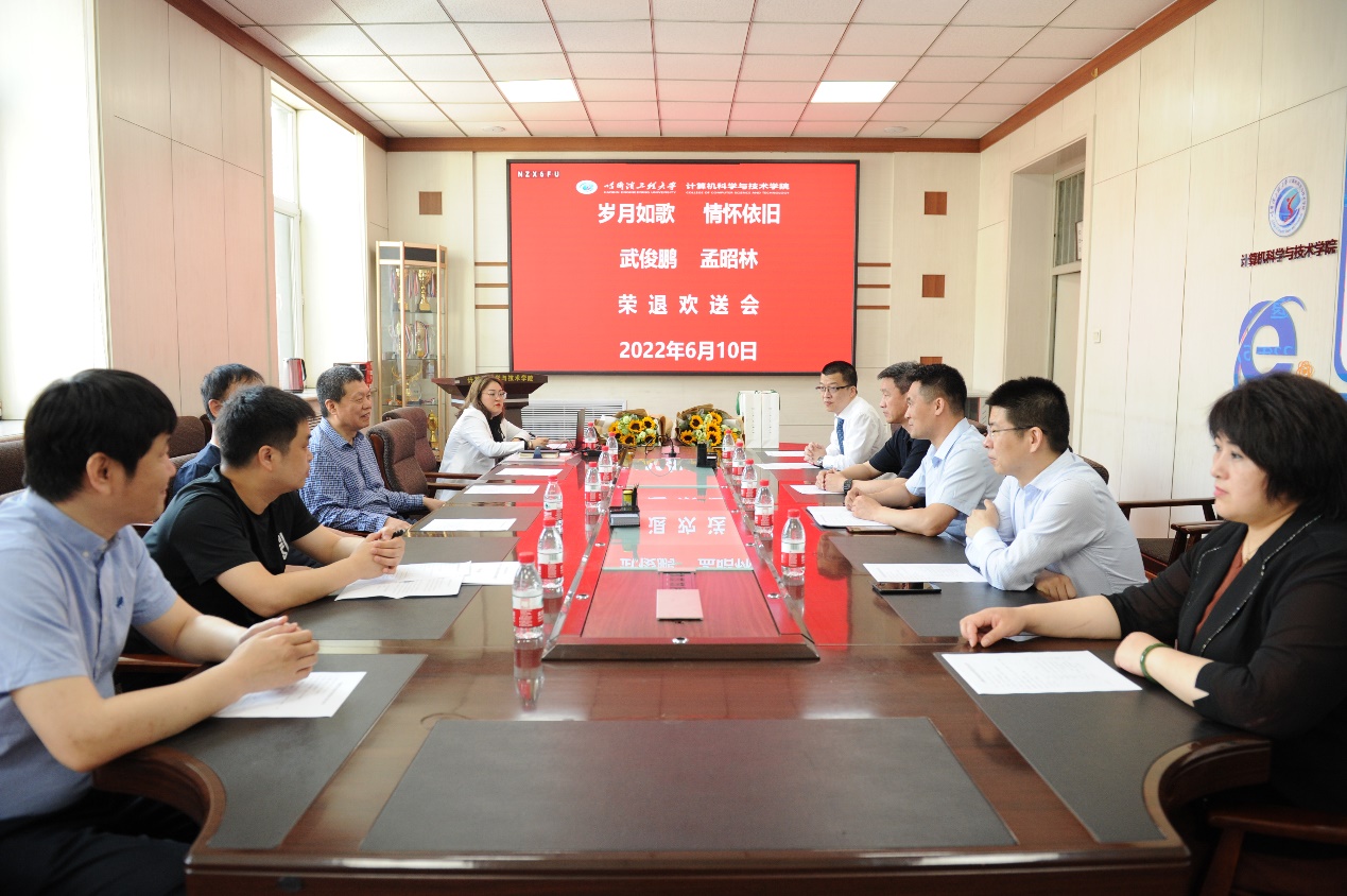 6月10日上午9:00,pg游戏电子模拟器在21#4017会议室为武俊鹏、孟昭林两位老师举行荣退欢送仪式。仪式由副院长田凯主持召开,院长蔡成涛、党委书记刘冬、副院长董宇欣、冯光升与荣退教师团队代表出席欢送仪式。