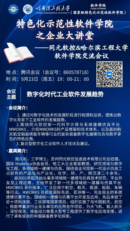 2022年9月23日晚19:00,特色化示范性软件学院(以下简称特软学院)开展企业大讲堂系列活动,邀请同元软控开展以“数字化时代工业软件发展趋势”的线上交流会议。我院教学副院长冯光升、苏州同元软控信息技术有限公司总经理周凡利参加会议。