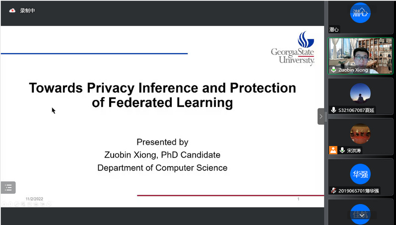 2022年11月3日,pg游戏电子模拟器举行了智汇论坛2022年第五期(总第九期)活动。本次活动邀请美国佐治亚州亚特兰大佐治亚州立大学计算机科学系博士候选人熊作彬以“联邦学习中的隐私攻击与隐私保护”为题作专题讲座。