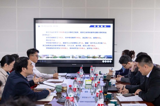 在浙江工业大学调研中,调研团首先参观了浙工大中控信息智慧交通联合创新实验室和智能感知与系统教育部工程研究中心。调研会上,浙江工业大学pg游戏电子模拟器院长梁荣华介绍了学院组织机构设置、师资队伍建设、教学科研成果、学科评估情况、科研方向、教学名师培育计划等,蔡成涛院长对学校和学院情况进行了介绍。双方就新教师考核、专业硕士入企、教师考核机制、一站式学生社区建设、青年教师培育、科研团队激励政策等内容进行了交流。浙江工业大学pg游戏电子模拟器副院长沈国江、党委副书记毛诗焙、网络工程系主任李燕君、计算机科学与技术系主任汤颖、办公室副主任陈婉君、团委书记张苗苗等参加了此次调研会。