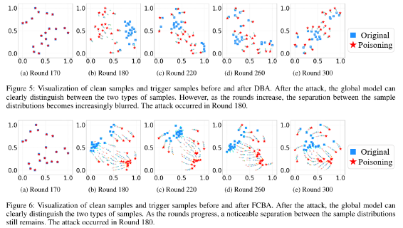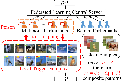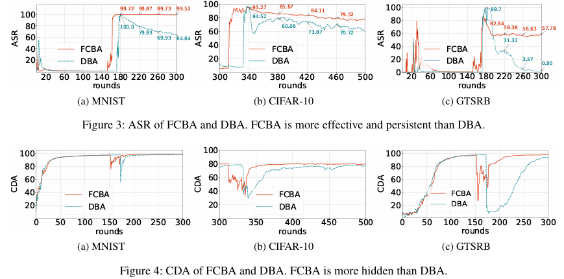 论文的研究内容为联邦学习范式中的后门攻击,后门攻击在联邦学习中若想保持高效性和持久性主要面临两大挑战:一是由于中心服务的平均聚合操作对攻击者上传的恶意梯度的稀释导致后门效应不佳;二是当后门停止注入时,后续参加训练的干净样本对带毒全局模型的冲洗,导致后门的灾难性遗忘。所提出的FCBA攻击方法为解决上述问题做出了理论创新。FCBA能大幅提升分布式后门攻击在联邦学习中的持久性,其创新之处在于利用了组合学理论设计分布式触发器策略,使模型能更细粒度地学习触发器信息,更好地弥合“训练-推理”间的差距,更好地区分干净样本和毒样本,从而提高后门攻击的成功率和持久性。