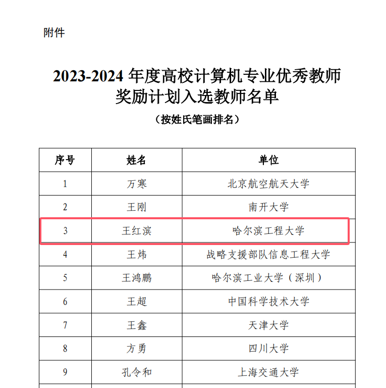 我院王红滨本科授课教师入选2023-2024年度高校计算机专业优秀教师奖励计划。该奖项由中国教师发展基金会颁发,奖励在计算机本科专业课程优秀的授课教师,以此高度肯定王红滨教师在教学工作取得的突出成绩。